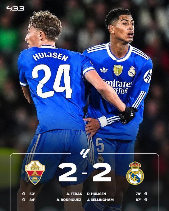 2025年11月24日 优势只剩1分!皇马2-2埃尔切两连平 贝林厄姆传射赫伊森首球
